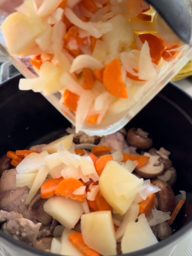 ①じゃがいもはいちょう切り、玉ねぎは回し切り(もしくは薄切り)、にんじんは半月切りにする。
