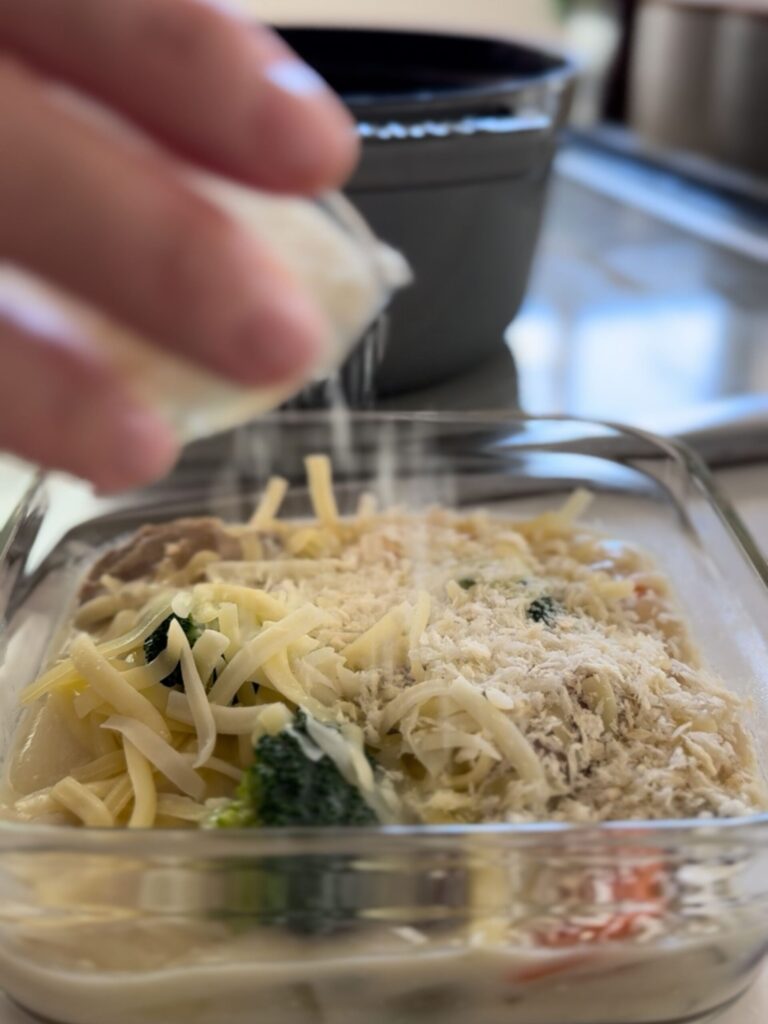 ①耐熱容器にアレンジ「1.」で作ったクリームシチューを入れ、チーズ・パン粉・粗びき黒こしょうをお好みで振る。