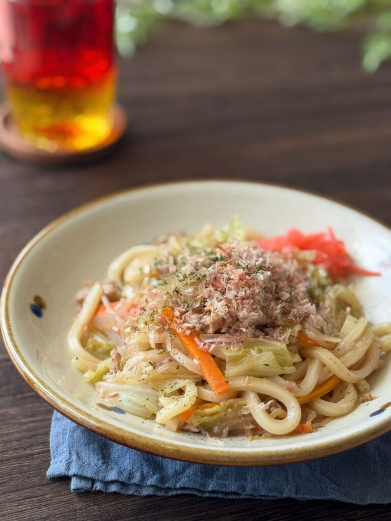 市販のソースに頼らず、しょうゆとみりん、かつお節の香ばしさで仕上げるやさしい焼きうどんです。