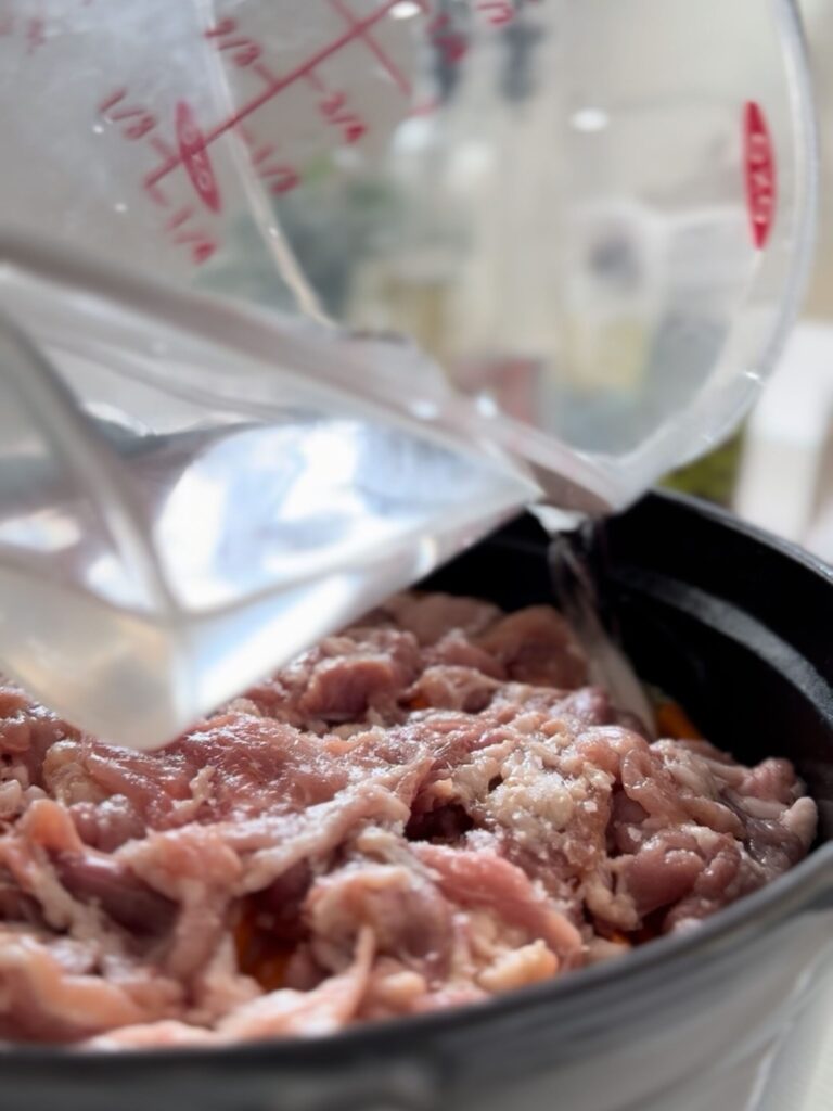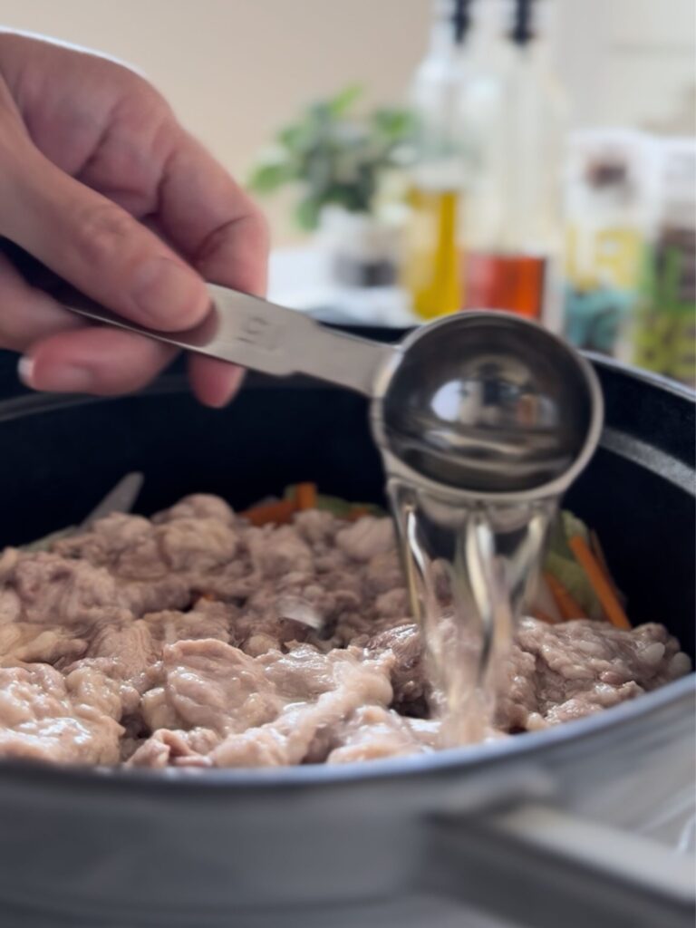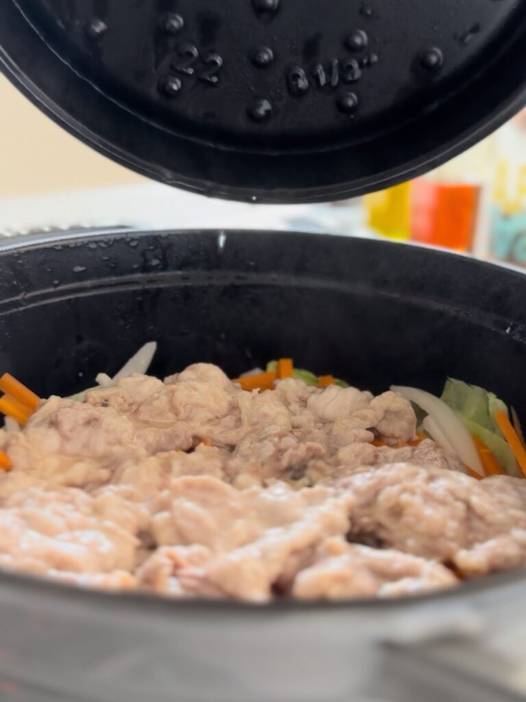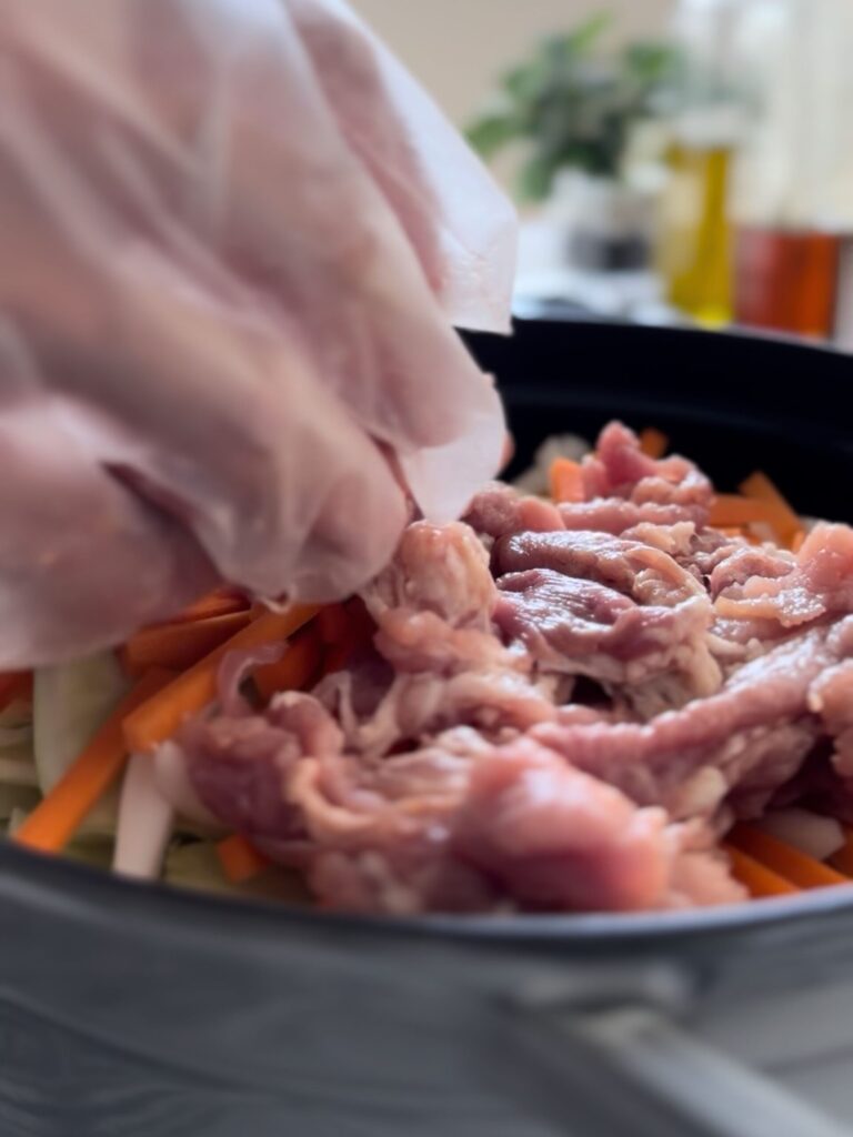 2.鍋に塩(ひとつまみ)→もやし→キャベツ→玉ねぎ→にんじん→にんにく→豚こま肉→塩(ひとつまみ)の順に重ねる。