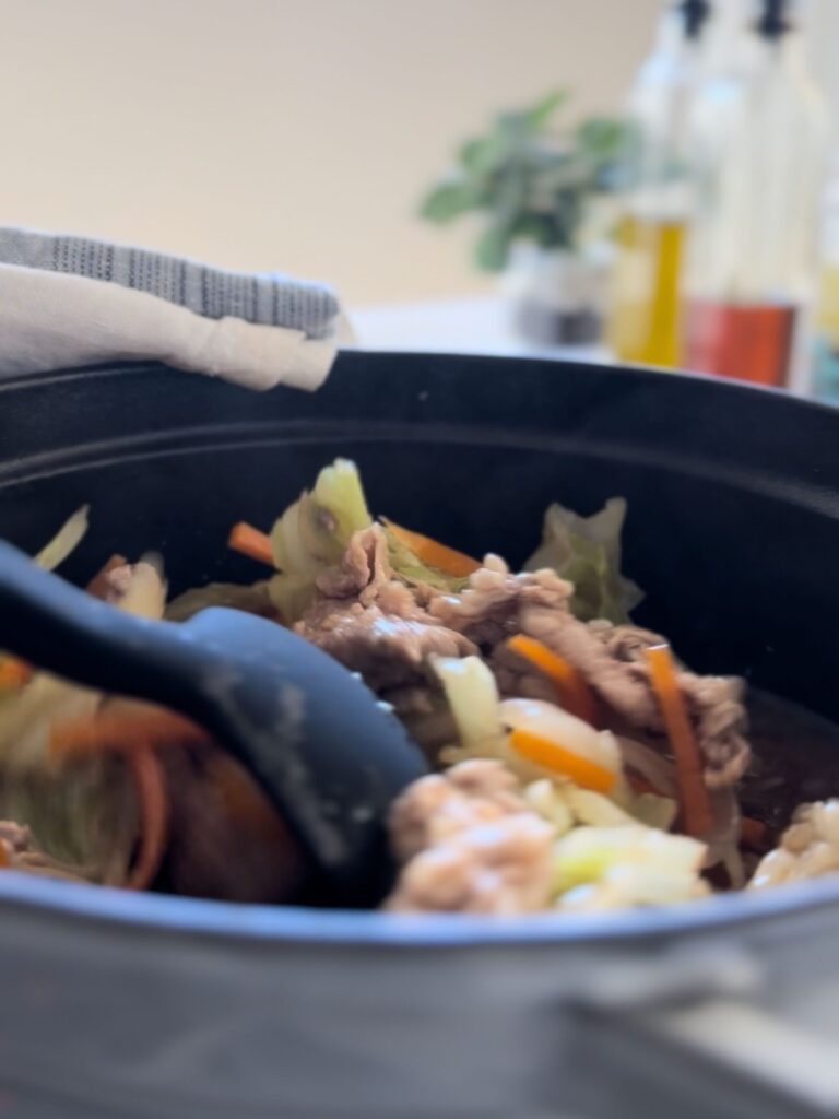4.蓋をあけて豚肉に火が通っていることを確認し、【A】をまわしかけ、ざっくり混ぜてさらに2分加熱する。