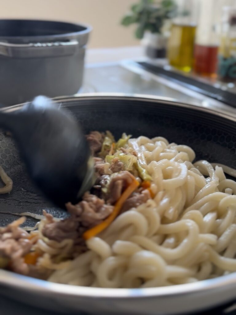 「重ね煮焼きうどん」は、市販ソースを使わなくても手軽に作れる優しい味わいの一品。油控えめでヘルシーなのに満足感があり、忙しい日でもパパッと作れるお助けレシピです。